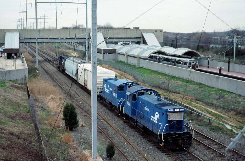 WHWA01 action on 04/06/93. Heading north past the Cheverly WMTA Metro station to switch Merchants Terminal on Cabin Branch Dr and the Giant compound in Landover, Md. Giant received covered hoppers of plastic pellets for making milk cartons and Merchants got reefers. Power was CR 9415/CR 9416/CR 8269.