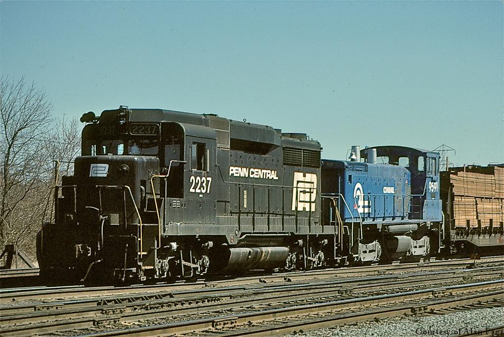 Former PC 2237 GP-30 and CR 9591 SW1500 (ex-RDG 2752) work Abrams yard in March, 1977.