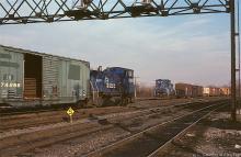 With ex-PC X44 class 50' boxcar 274858 in tow, CR SW-1500 9594 (ex-RDG 2755) works Abrams yard on President's day, 1982.