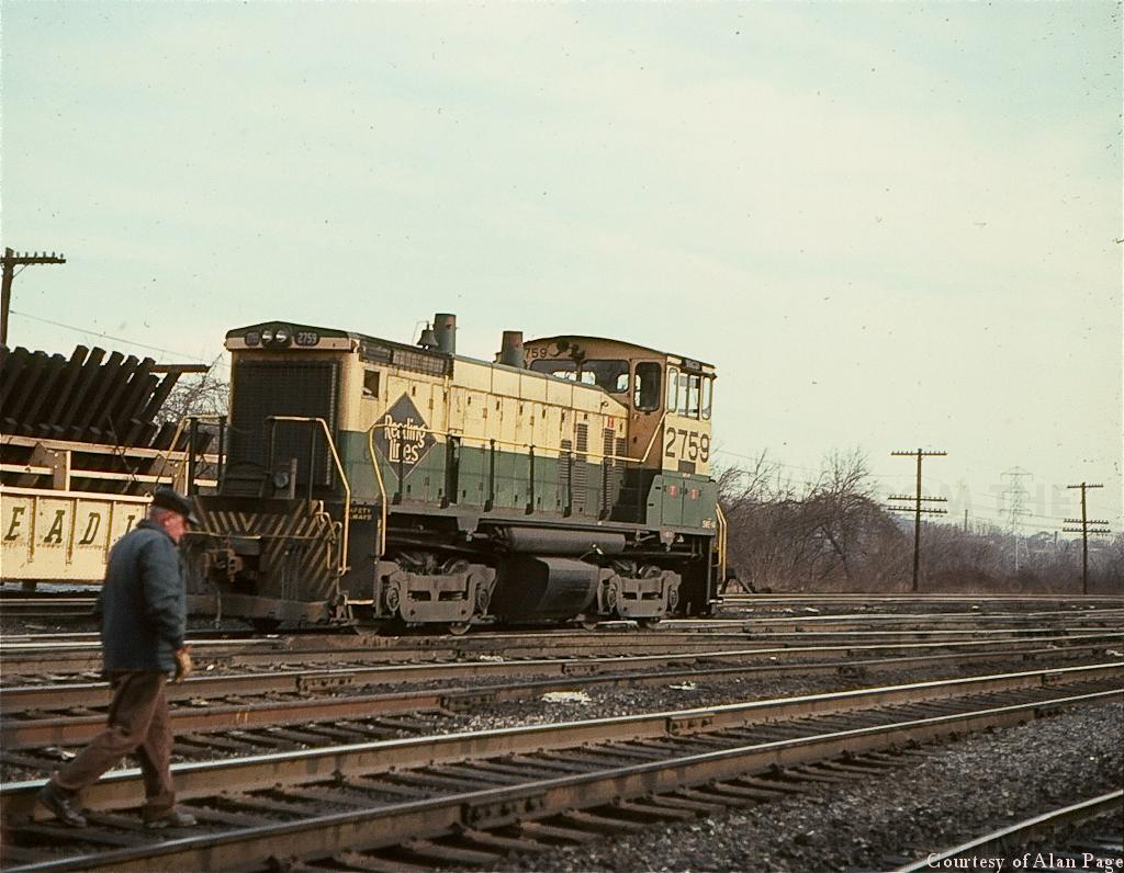 One of the longtime former Reading employees passes by his Abrams workhorse, RDG SW1500 2759 (soon to be CR 9598), in February, 1977.