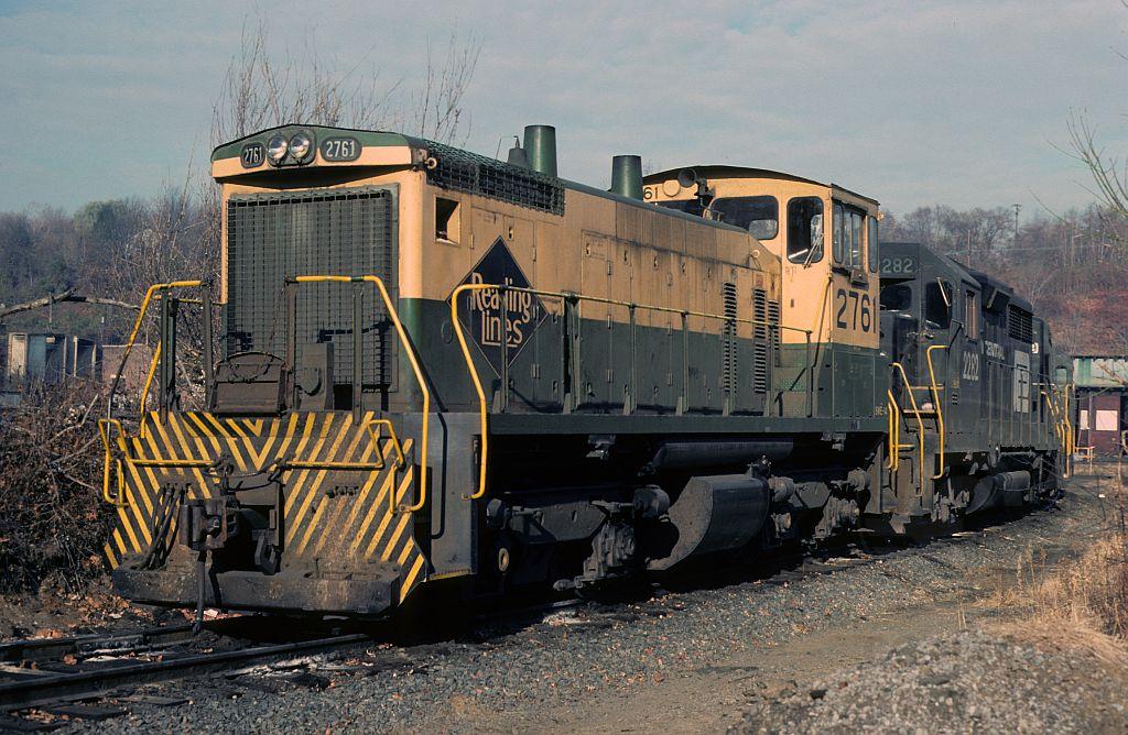 Reading Lines SW-1500 rests near the Bethlehem engine house in November 1976 along with two Penn Central units. It would become Conrail 9611 and survive to become property of Norfolk Southern as their 2240. It has been retired.