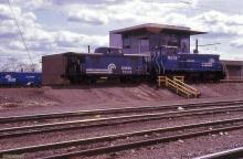 Conrail SW1500 9615 (ex-RDG 2765) is seen on the Morrisville hump with class N8 caboose 23342 in 1984.