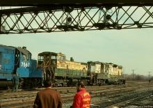 Many railfans were on hand at Abrams while RDG GP7 625, GP10 7567, RDG SW1500 2766, and RDG GP7 636 worked the yard on February 12, 1977.