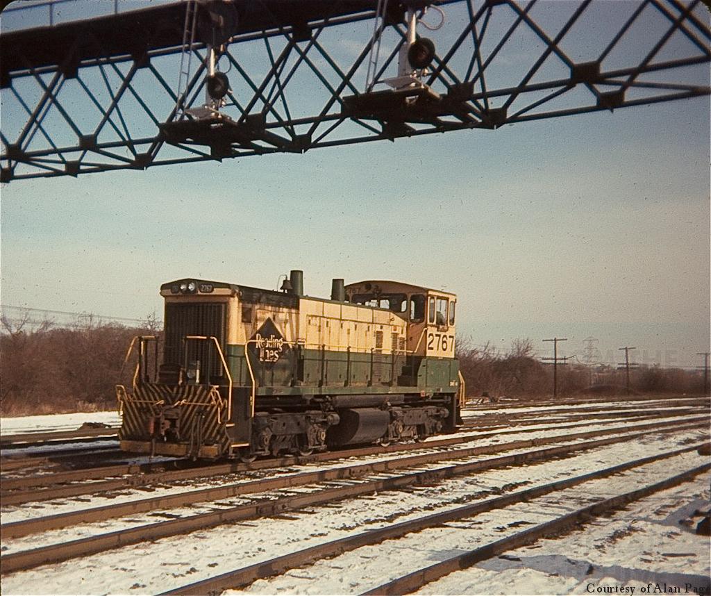 RDG SW1500 2767 (CR 9617) idles under the signal bridge at Abrams yard in January, 1977.