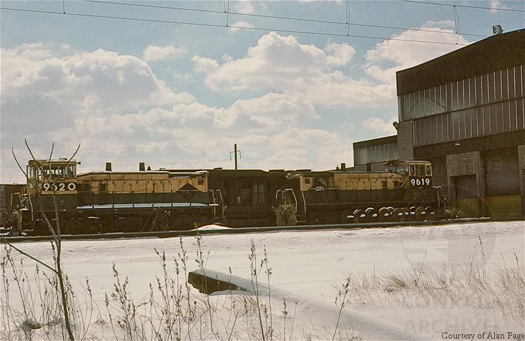 CR sister SW-1500's 9619 (ex-RDG 2769) and 9620 (ex-RDG 2770) are surrounded by snow outside the Morrisville shops in March, 1978.
