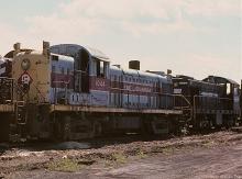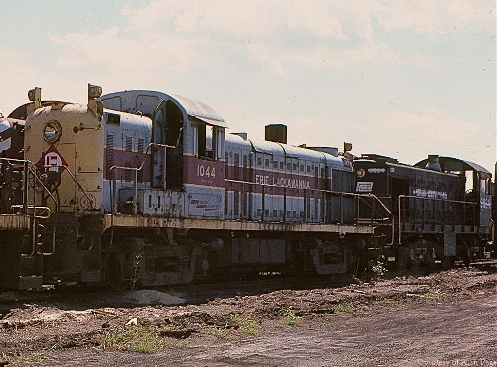 Former EL RS-3 1044 (CR 5260) rests retired with whitelined PC S2 9824 at the Juniata shops deadline in August, 1977.