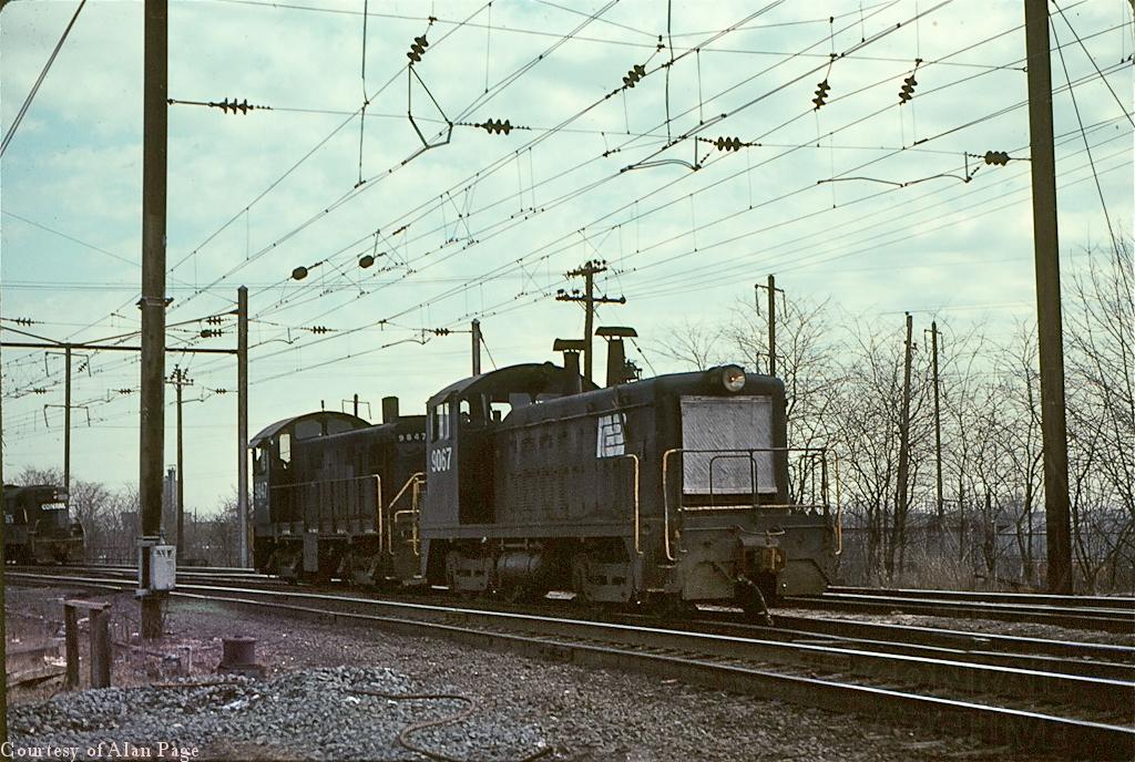 PC SW-7 9067 works alongside one of only six Alco T-6's, 9847, at Morrisville yard in March, 1977.
