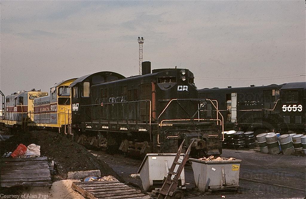 Retired PC units, Alco T-6 9847 and GP-7 5653, rest with CR SW-9 9013 (ex-EL 437) and GP-7 5974 (ex-EL 1236) behind the enginehouse at Croxton in March, 1979.