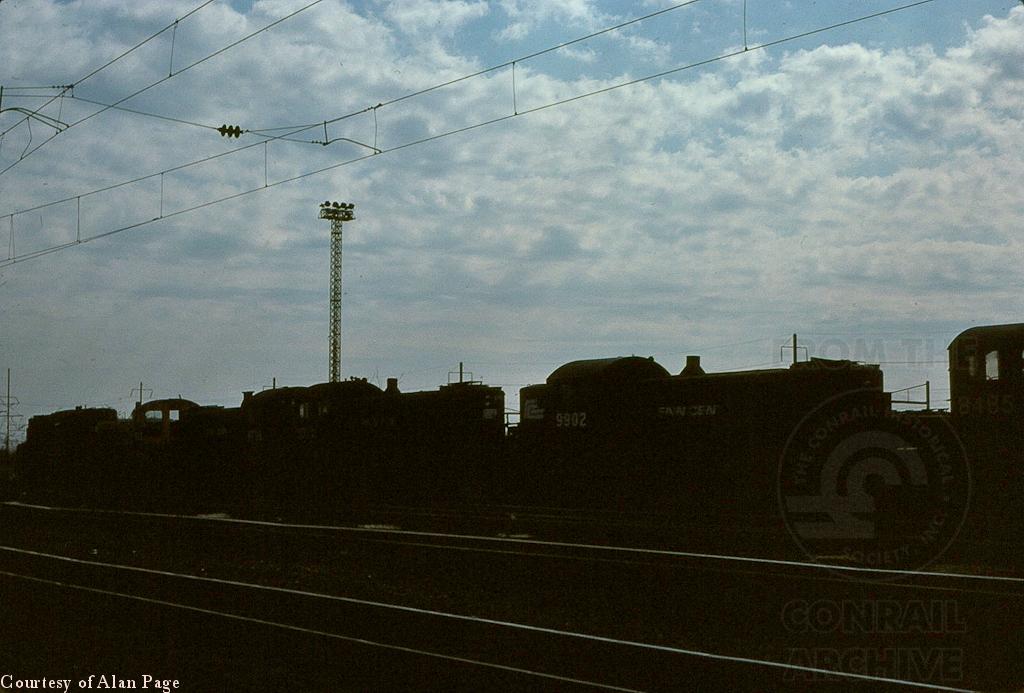 Sandwiched between S-4 9770 and SW-1 8485 at sunset in Morrisville on March 5, 1977, former PC RS-1 9902 rests in a line of stored units.