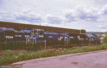 Conrail SW1500 9612 (ex-RDG 2762) is seen behind the Juniata Shops with RS3M 9999 (ex-EL 1049) in 1983.