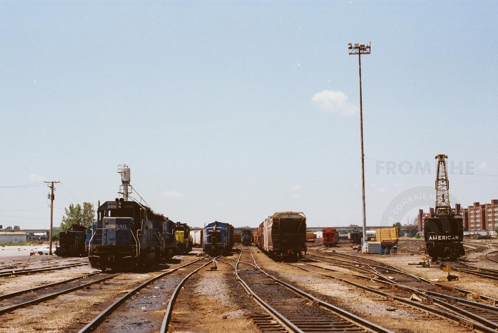 Conrail's "Chicago Junction" Ashland Avenue Yard in July 1983. View looking west at Ashland Avenue. The engine terminal is to the left. Doug Davidson photo with permission