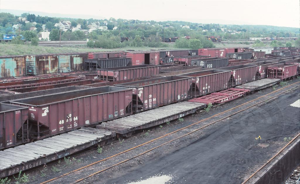 An overview of Rose Yard in Altoona, PA on 6/7/97, shows many stored cars that includes 3 bay coal hoppers as well as other rolling stock.