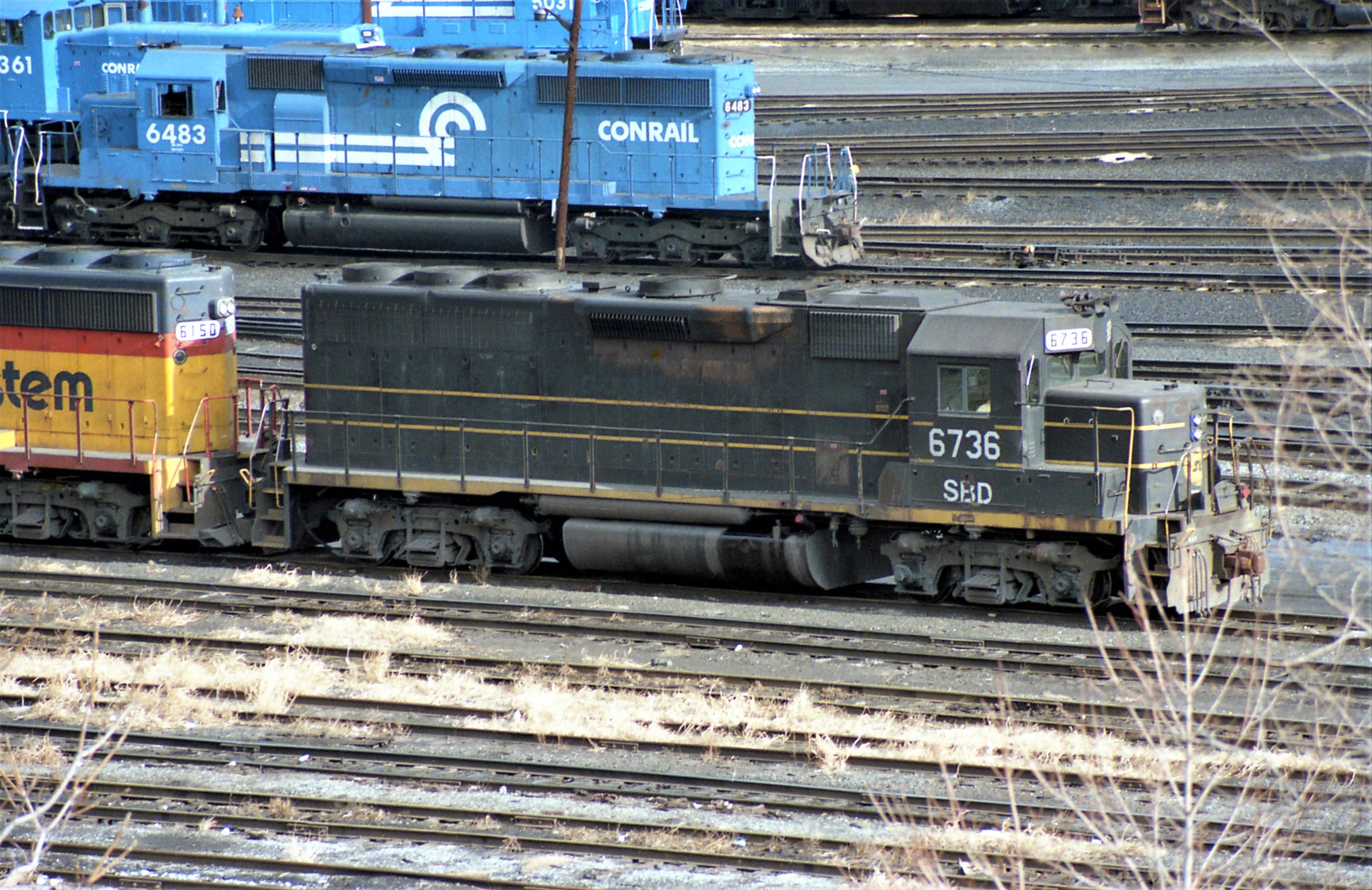 Chessie-CSX. Ex-Seaboard Coast Line SD-40 #6736 at Enola, PA. May 5, 1986