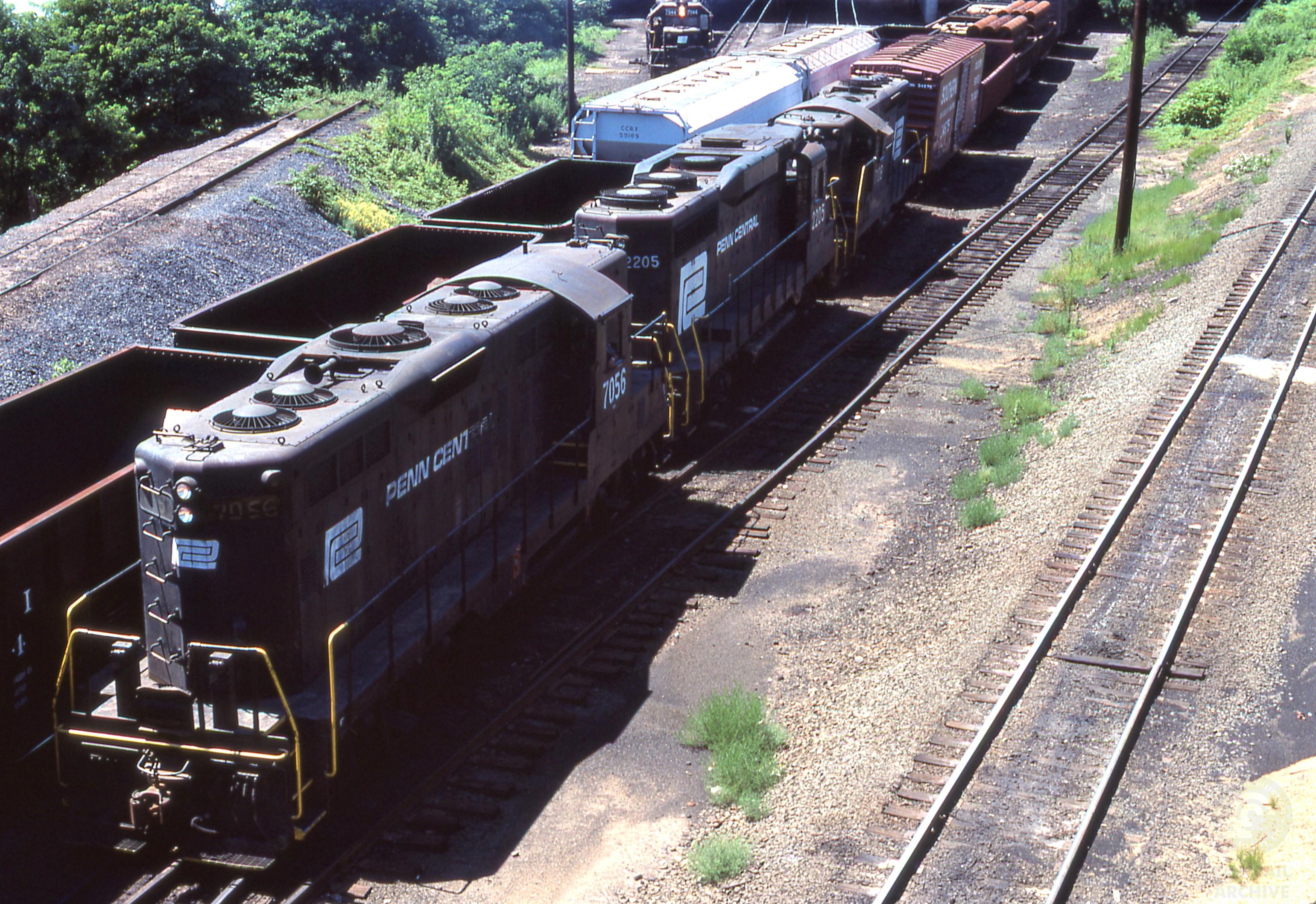 Ex Penn Central GP-9 #7056; GP-30 #2205, & GP-9 #7008 with westbound freight at the west end of Enola, PA yards. July 15, 1976. Since Conrail was new in the summer of 1976, there were ample opportunities for photography of different railroad paint schemes! This photo was taken at the Iron Bridge at the yards.