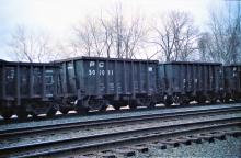 Conrail. Ex. Penn Central G39b Ore car #501081. Large car on Middle Division freight. March 1983