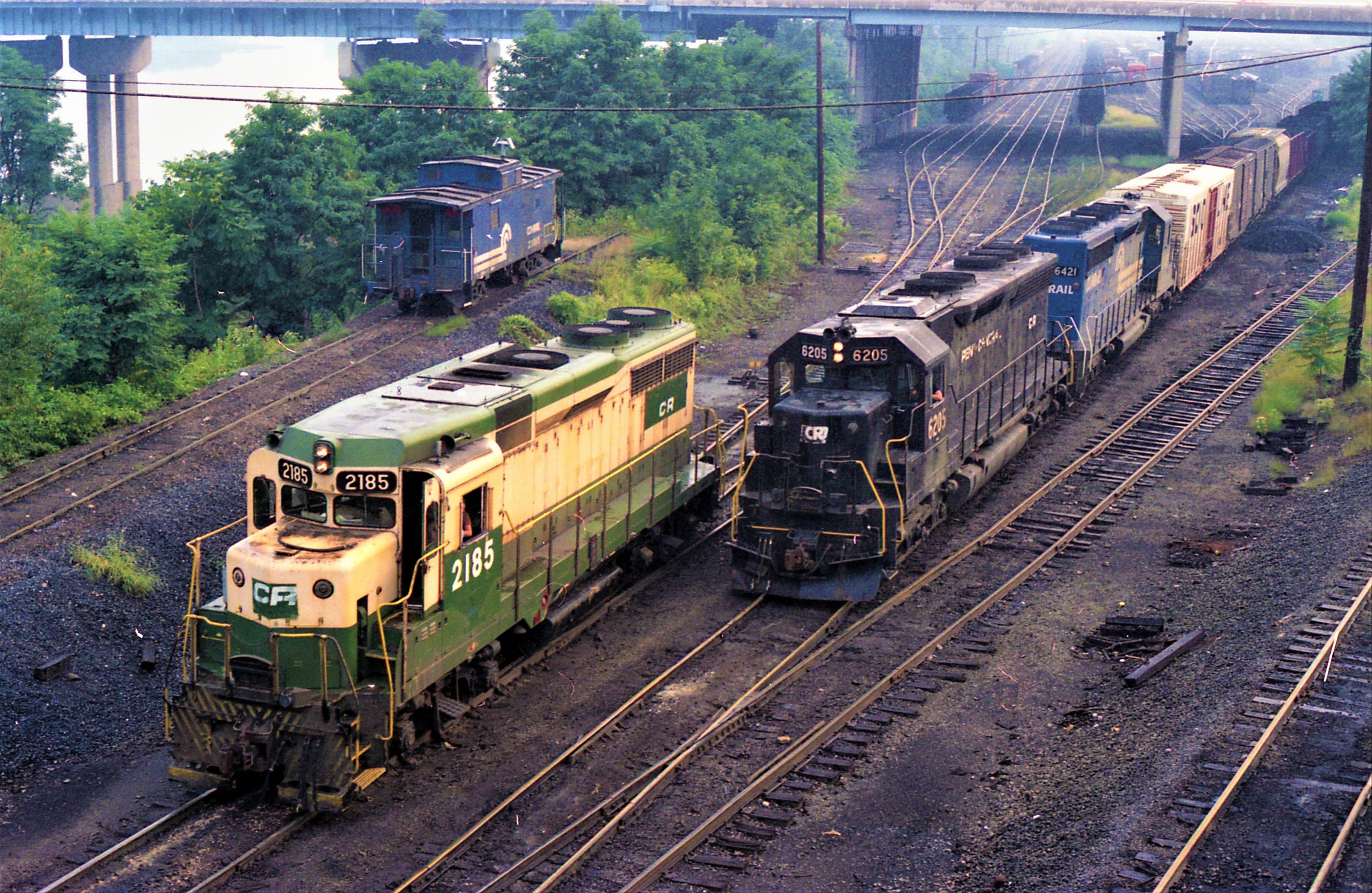Conrail. Ex-Reading GP-30 #2185; ex-Penn Central SD-40 #6205 & Conrail SD40-2 #6421 at the west end of the Enola, PA yards. The gravity caboose track was still in use with NE-6 #23065 waiting for a freight on July 24, 1980. Photo from Iron Bridge