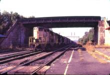 Ex Reading GP-9 #635 with freight train under Rt 206 bridge. Eastbound at Belle Meade, NJ. September 17, 1978. Train is passing the old Route 206 bridge at the Belle Meade station location, abandoned at the time.