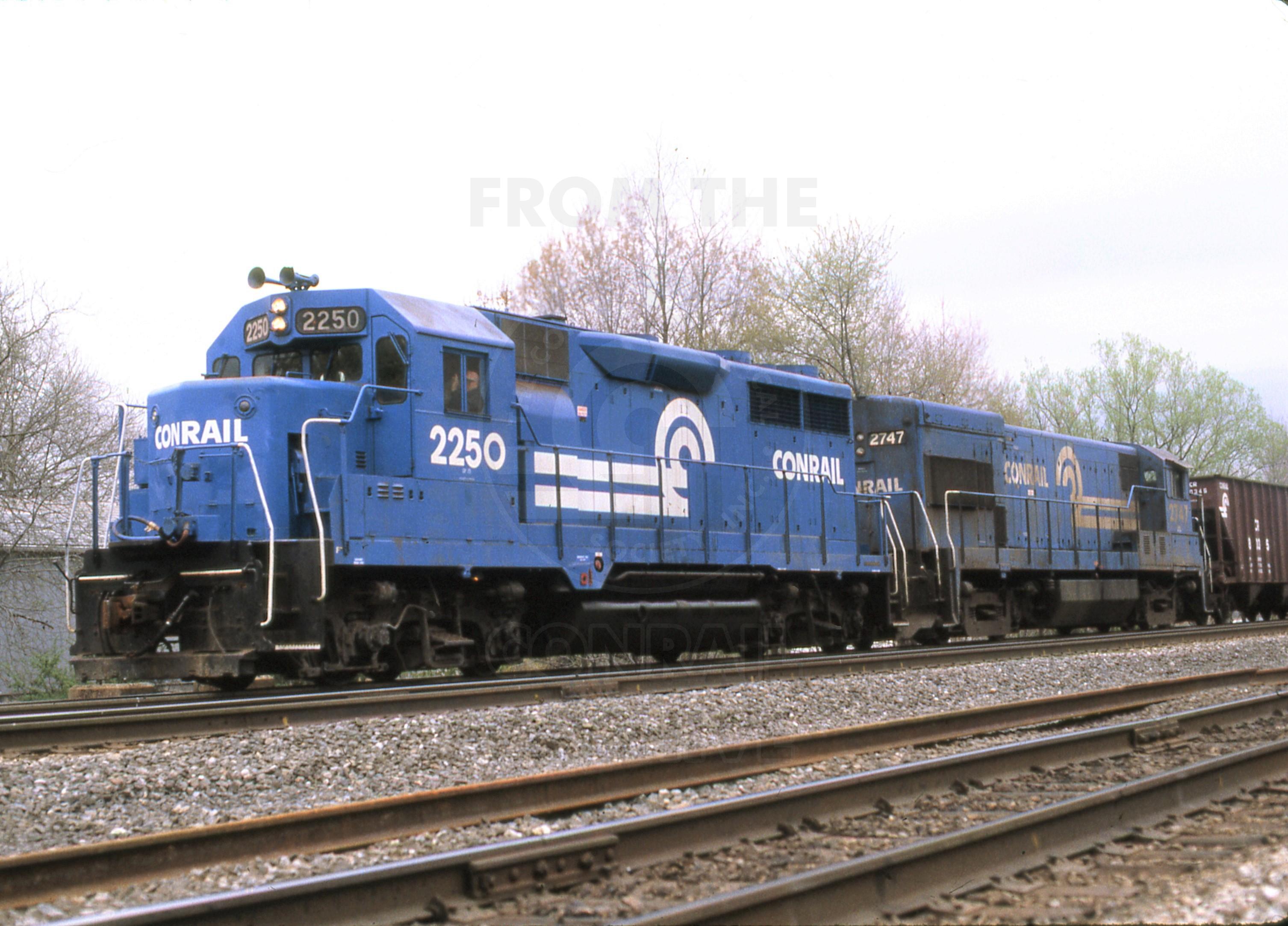GP-35 #2250 & U23B #2747 with freight west of Enola yards. April 28, 1984
