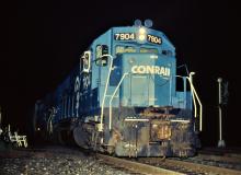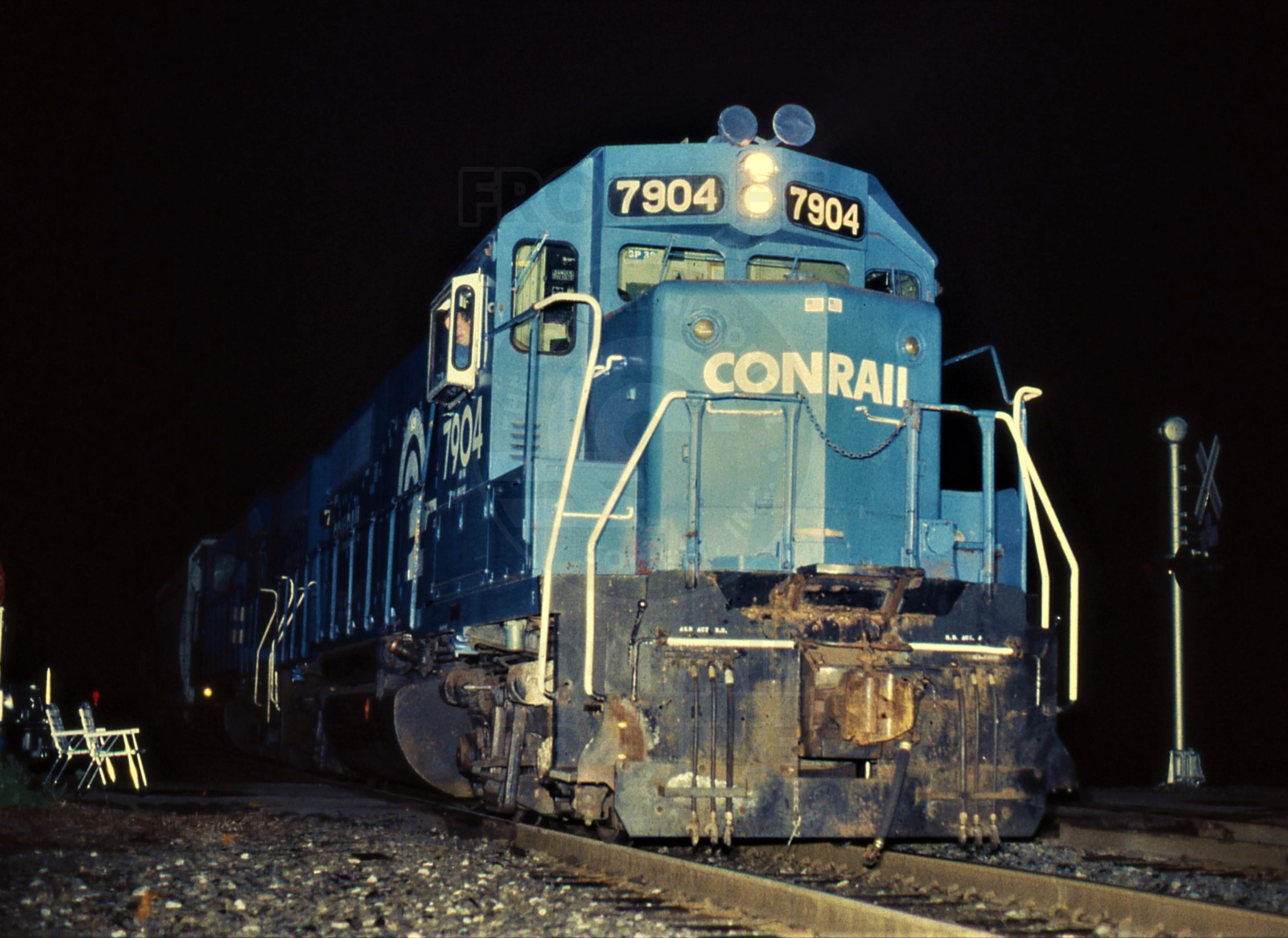 Conrail. GP-38 #7904 with eastbound freight at Prospect Avenue crossing, Piscataway, NJ. The evening of July 18,1982 photo was taken with a Nikon FM-2 film camera, the shutter speed was 1/125sec, with the aperture of f2.8 & the Vivitar 5200 flash set on 'manual' discharge. I have 2 Nikon FM-2 cameras, the older one has a flash sync of 1/125 & the newer one has a flash sync of 1/250 sec. I used the Kodak improved Ektachrome with an ASA of 200. Less grain than the old Kodak 160 ASA. Although the track speed is 50 MPH, this train was traveling approximately 40 MPH. Looks like the air hose is a bit low!