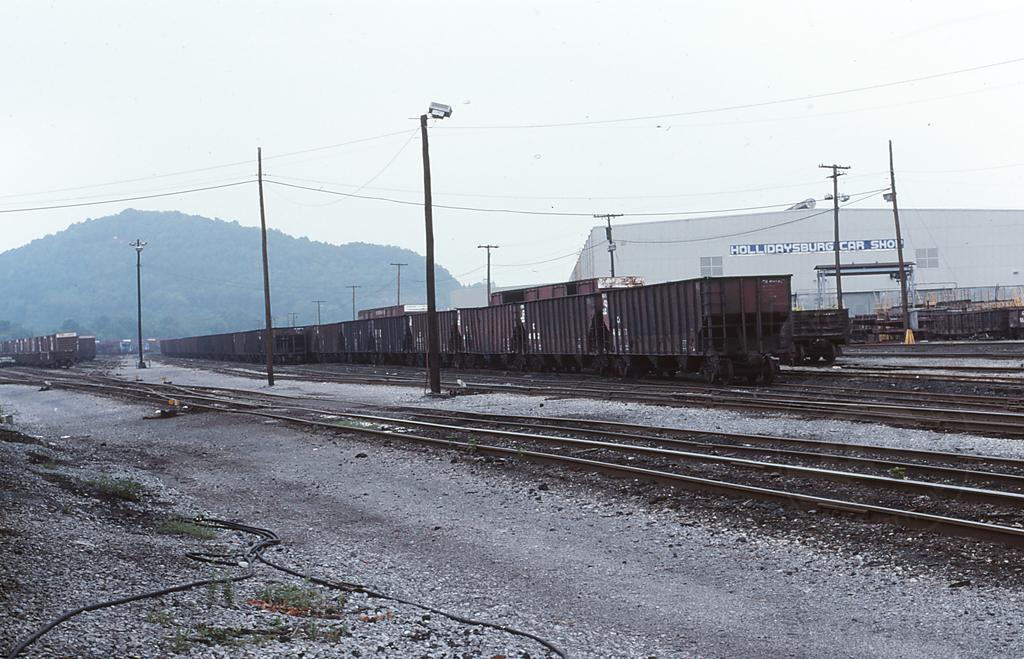 A view of CR's Holldaysburg PA Car Shops on 7/27/97 shows many 3 bay hoppers being stored.