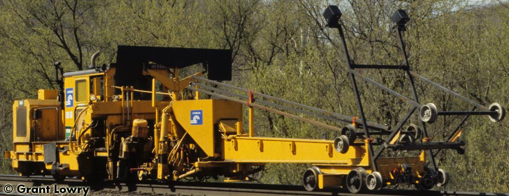 Conrail ballast tamper ME 5062 is seen at Spruce Creek, PA in April 1989