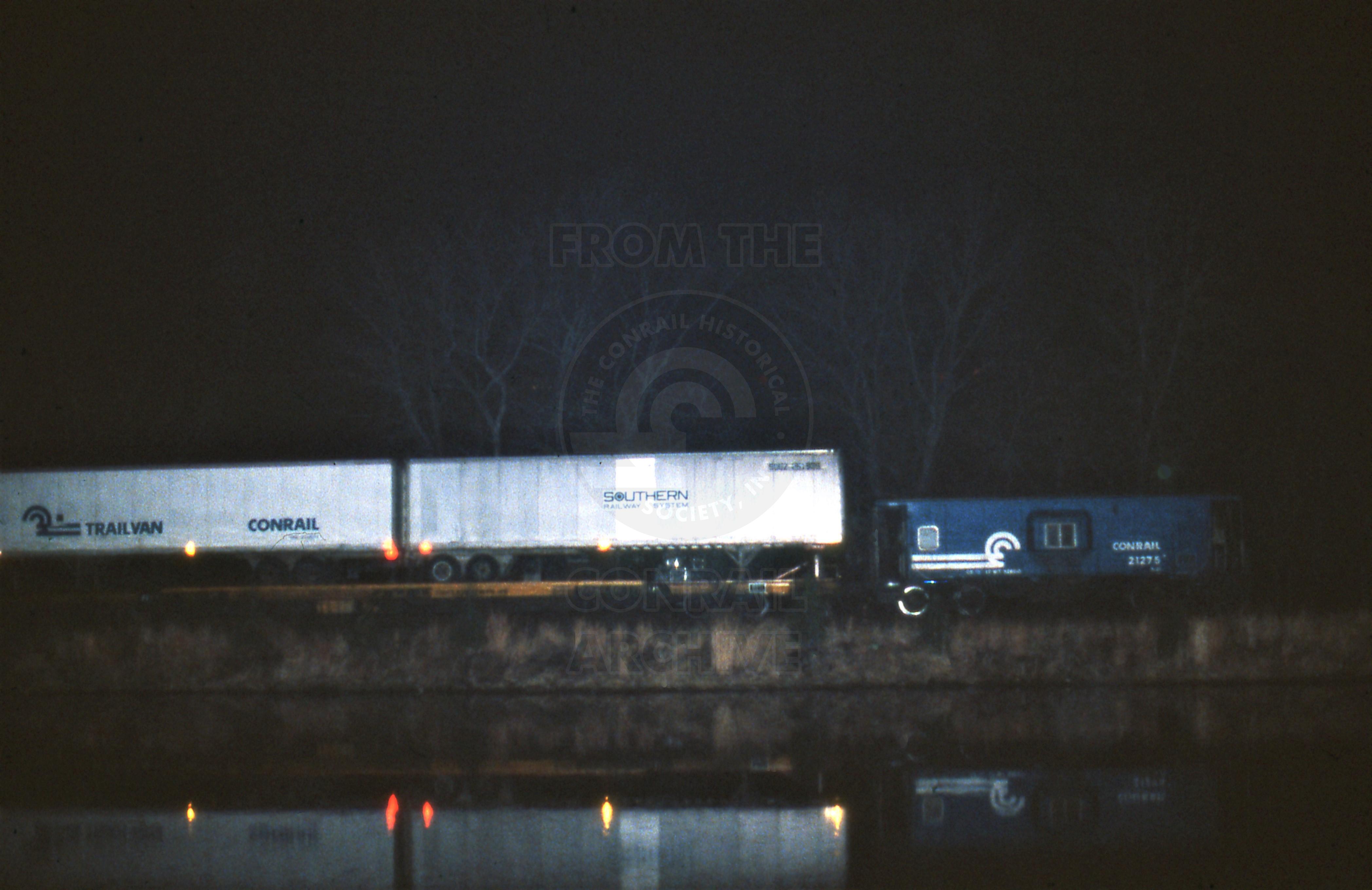 Conrail N21 caboose #21275 at New Market pond at night with westbound freight. Experimental photo on August 21, 1981. Nikon FM-2 camera, 1/125 sec, f2.8, ASA 400 Ektachrome, Vivitar 5200 flash set on manual. I took this photo standing on New Market Road shooting across the pond...just to see what happens! Strange & unusual photo!