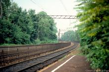 Erie Lackawanna low (3200 series) and high roof (3300 series) MU's run through Maplewood, NJ in August, 1979. The MU's retained their EL olive paint and gold numbering until their final runs in August, 1984 when Edison's 3000 volt DC power was turned off and 25000 volt 60 hertz AC turned on.
