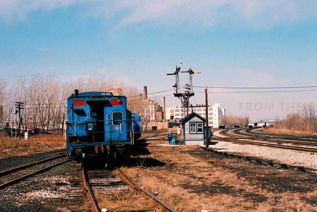 Previous Next Conrail's Panhandle Job with a transfer caboose at Brighton Park in April 1987. This view is looking north at the manually controlled interlocking. Doug Davidson photo with permission Photo By Doug Davidson Year 1987 Original Date 4/1/87 Location City Brighton Park IL Additional Galleries Doug Davidson's Chicagoland area Conrail Memories Collection CRHS Conrail Photo Archive Contributions