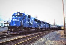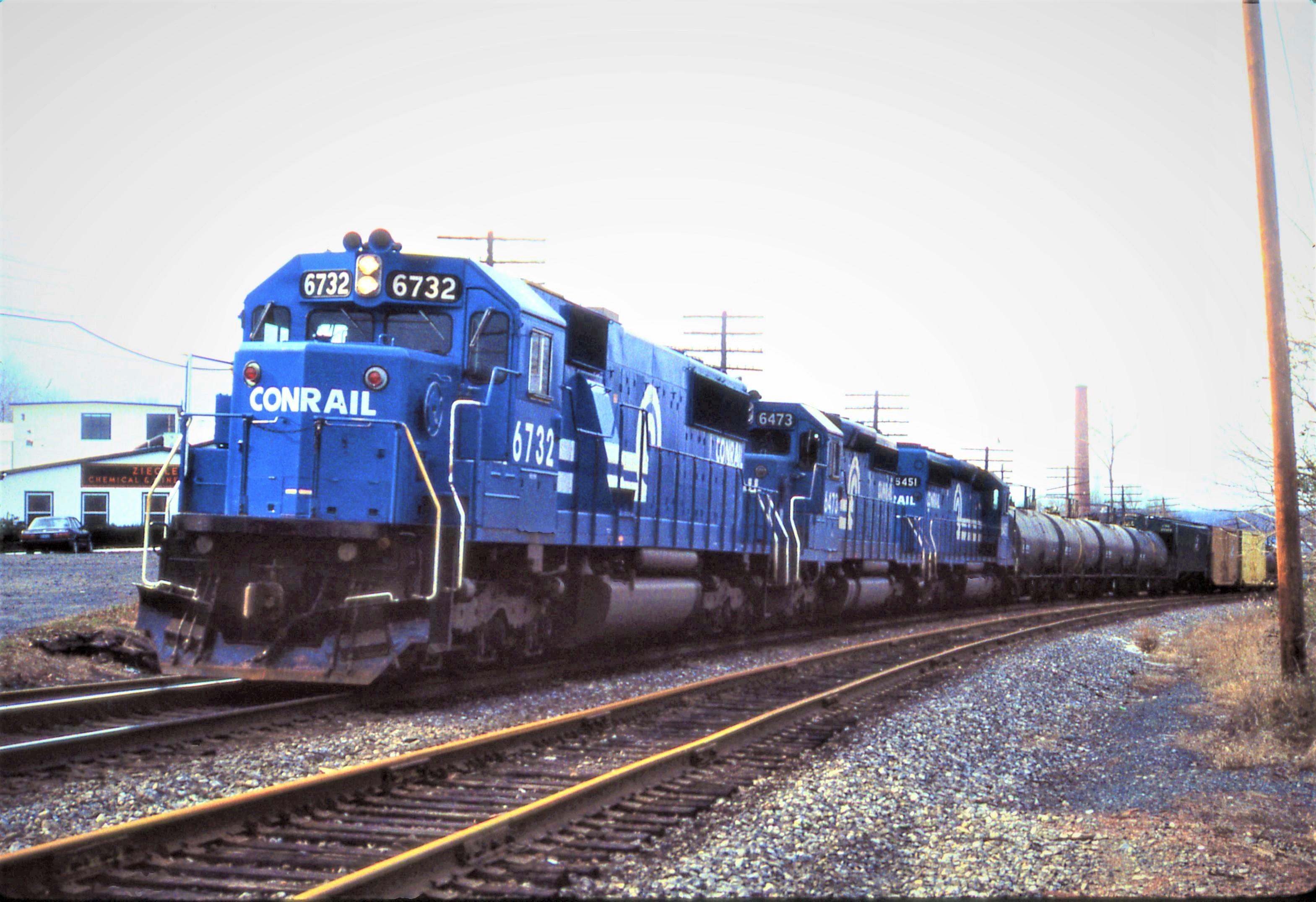 SD50 #6732, SD40-2 #6473 & #5451 with eastbound PIOI at Prospect Ave, Piscataway, NJ on an overdast December 14, 1985. Note the rusty out of service track 1. The #5451 is a former Peoria & Eastern GP-7 #5617 which was built in November 1950 and rebuilt by Conrail on November 8, 1978.