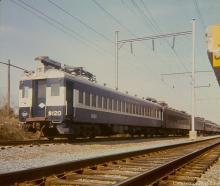 RDG MU 9120 waits on Sunday for the commuter runs to begin Monday morning from Warminster to Reading Terminal in November, 1976. The Reading purchased 100 in 1929 and 1030 for suburban Philadelphia commuter service. MU 9120 was one of 38 rebuilt in 1964 and repainted from the original olive green to blue and white.