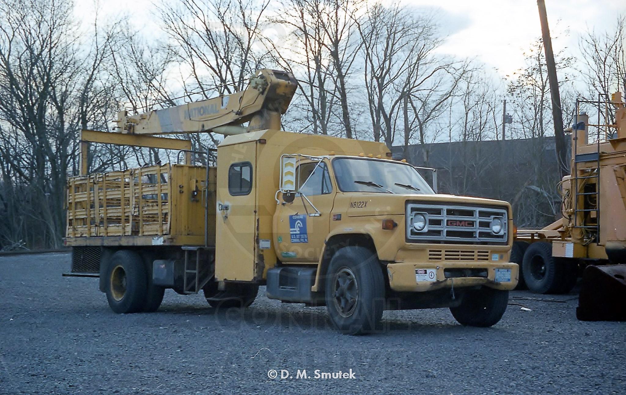 N8122X is seen at the CSAO MW Shop in South Plainfield, NJin early 2001. This wasa CR Class N8Stake / Platform Truckwith a GMC 6-man conventional cab, a frame mounted crane and a 12' stake body.