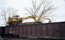 CJ 1005 is seen in Campbell Hall, NY in November 1998. This wasa Marmon Transmotive Jimbo II Tie Unloader / Material Handler. These machines were used to load / unload ties from gondolas.When equipped with a magnet, the unit wasused for loading / unloading rail, tie plates and other track materials (OTM).The walking beam construction permits car-to-car movement.