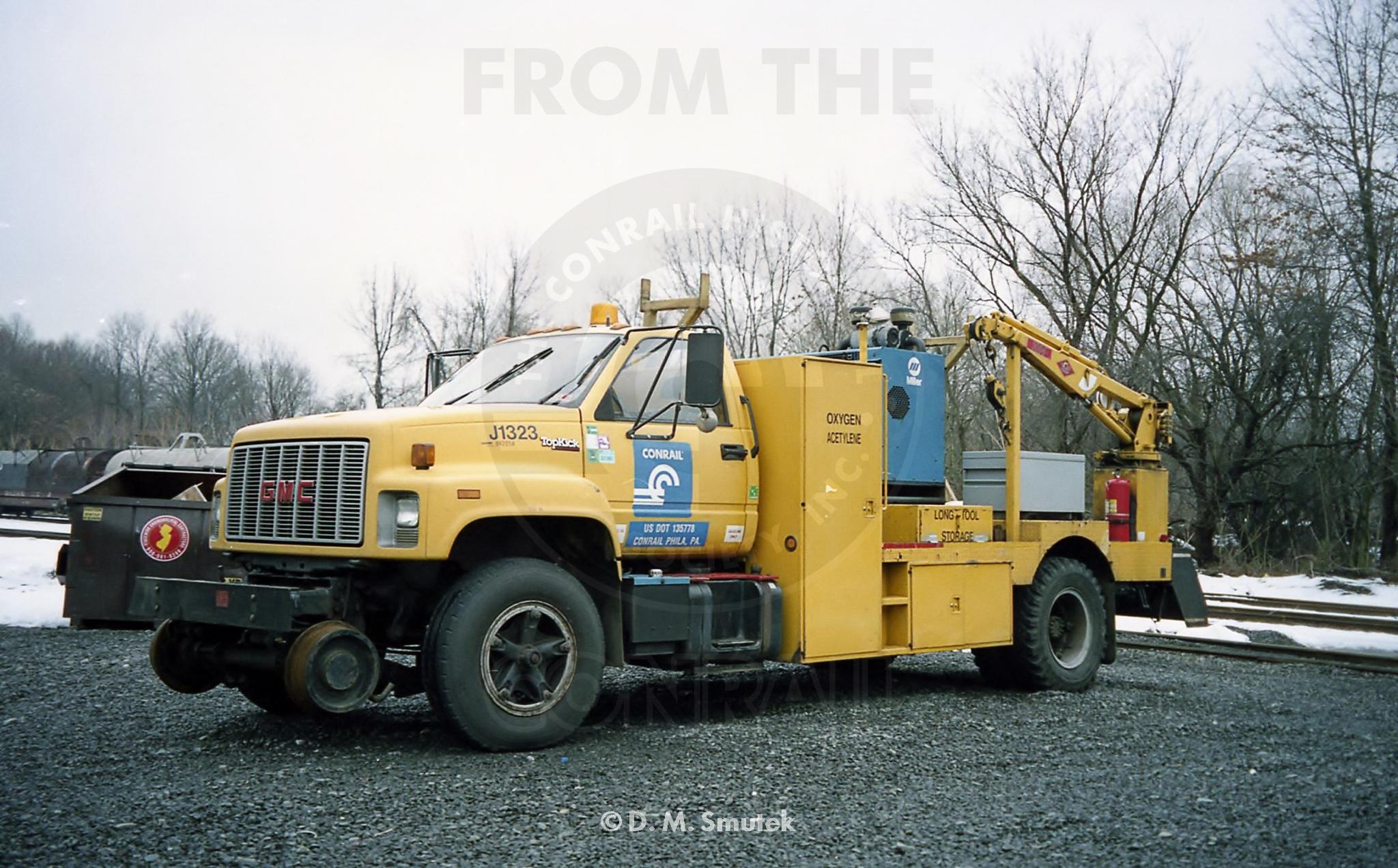 J1323 is seen at the CSAO MW Shop in South Plainfield, NJ in early 2001. This wasa CR Class J1 Welders Truck with a GMC 3-man conventional cab and hi-rail wheels.