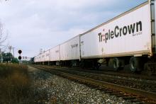 A Triple Crown road-railer(either RR241 or RR261) heads west on the former PRR, near Mansfield, OH, on September 26, 1994. Doug Davidson photo with permission