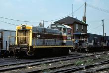 CR SW-9 9019 (ex-EL 448) idles at Secaucus, NJ in August, 1979. CR 21303 N21 class cabin and a sister bay window caboose rest by the yard office.
