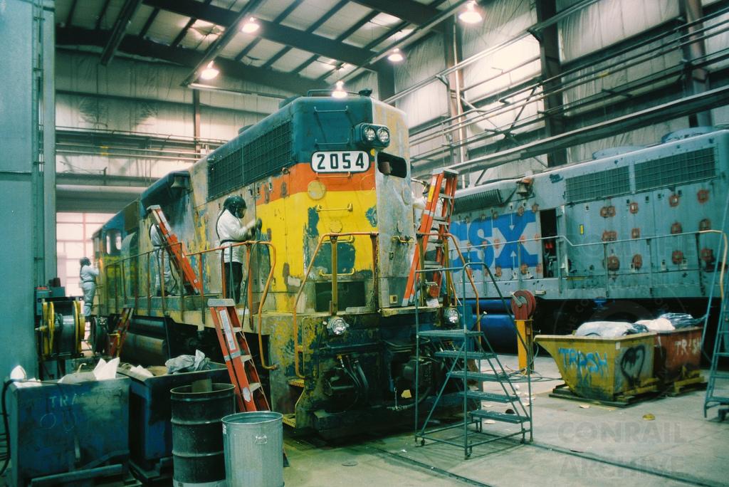 Action in the Paint Shop at Conrail's Juniata Shops on October 3, 1994. At the time of Doug's visit, Conrail was performing contract work for CSX, explining why these CSX units were being prepared for repainting. Doug Davidson photo with permission