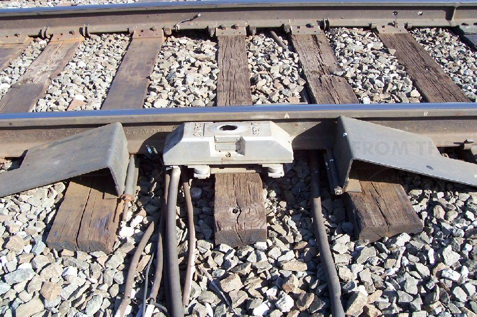 A closeup view of the equipment of the detector at Harper, Ohio. This is the Servo Hotbox detector with protective ramps built around it to protect it from Dragging Equipment. The Servo has a door that unlocks when a train is on its circuit-the door protects the beam which measures the bearings as they pass over it, and closes when the train is gone. A detector does not know if a bearing is hot, it compares all bearings for any unusual ones. It also keeps a record printed out in the bungalow. Photo by Eric Kretz.