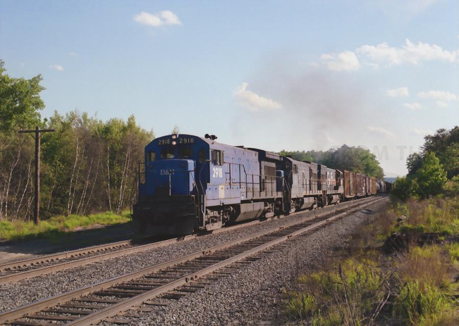 Stenciled for the D&H, ex CR 2918 leads MEBA near Lake Pleasant in Montague, MA. June 15, 1985. Exemplifying the interchangeability of parts, note the access panel below the cab on the 2918, which obviously came off another D&H unit. In the Guilford scheme of things, ironically, the two U23B's following have become MEC property, coming from the D&H.