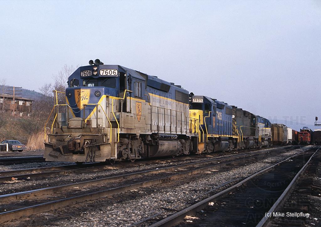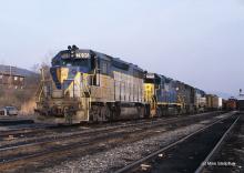 The Westbound D&H salt train GV-1 arrives at Hornell as an Eastbound D&H train departs.