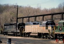 D&H GP-39-2's 7610 and 7416 are coupled up with CR SD-45 6230 at Bethlehem in April, 1977.