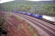 Previous Next An eastbound TV train is seen between South Fork and Mineral Point on the Pittsburgh Line in 1984. Photo By Dick Bregler Year 2008 Original Date 12/15/08 Location Details Pittsburgh Line Additional Galleries 1984 Images Collection CRHS Conrail Photo Archive Contributions