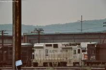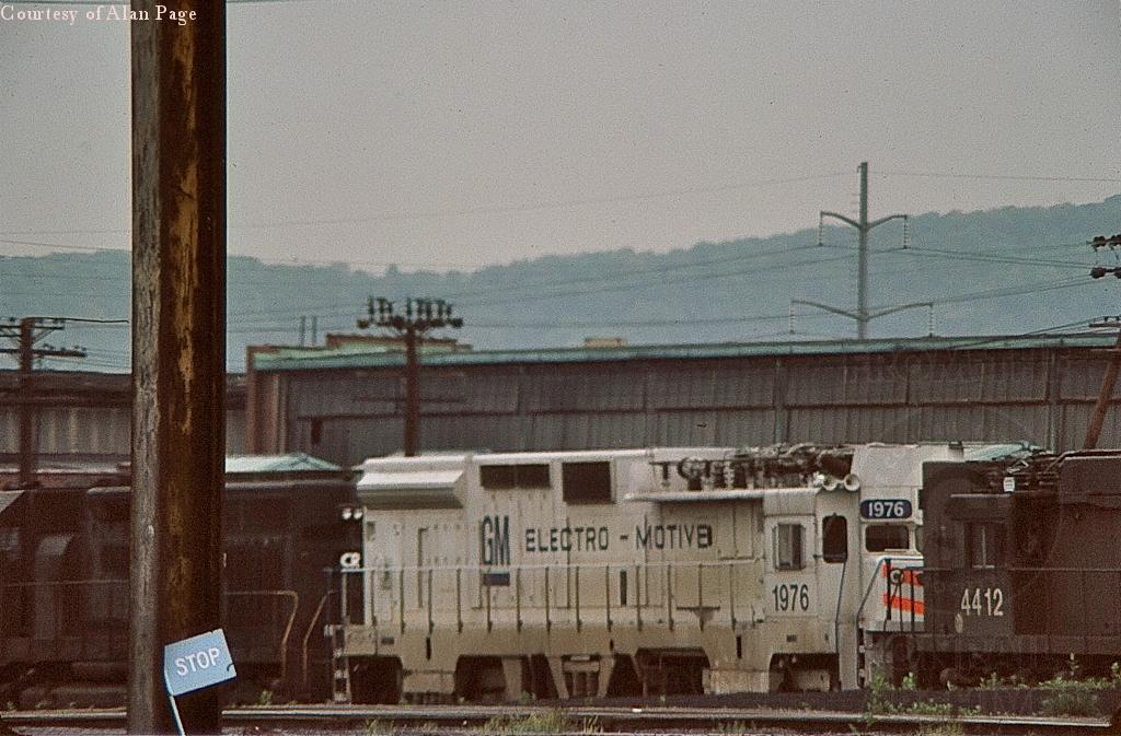 CR SD-40 6282 rests in short term storage with electrics EMDX 1976 and E-44 4412 at Harrisburg yard in May, 1977.