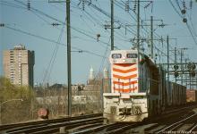 EMDX 1976 GM10B threads mixed freight through the crossover on the Northeast Corridor at Morrisville, PA.