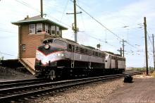 A duo of NJDOT E-8A's pass by Essay Tower in South Amboy, NJ in July, 1981. The tower has a few more years until it's closure on 7-2-1986.