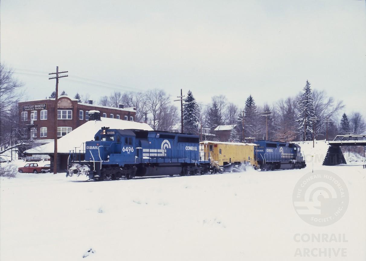 SD40-2 6496 trails the flanger past the depot in East Brookfield, MA. on Jan. 20, 1987.