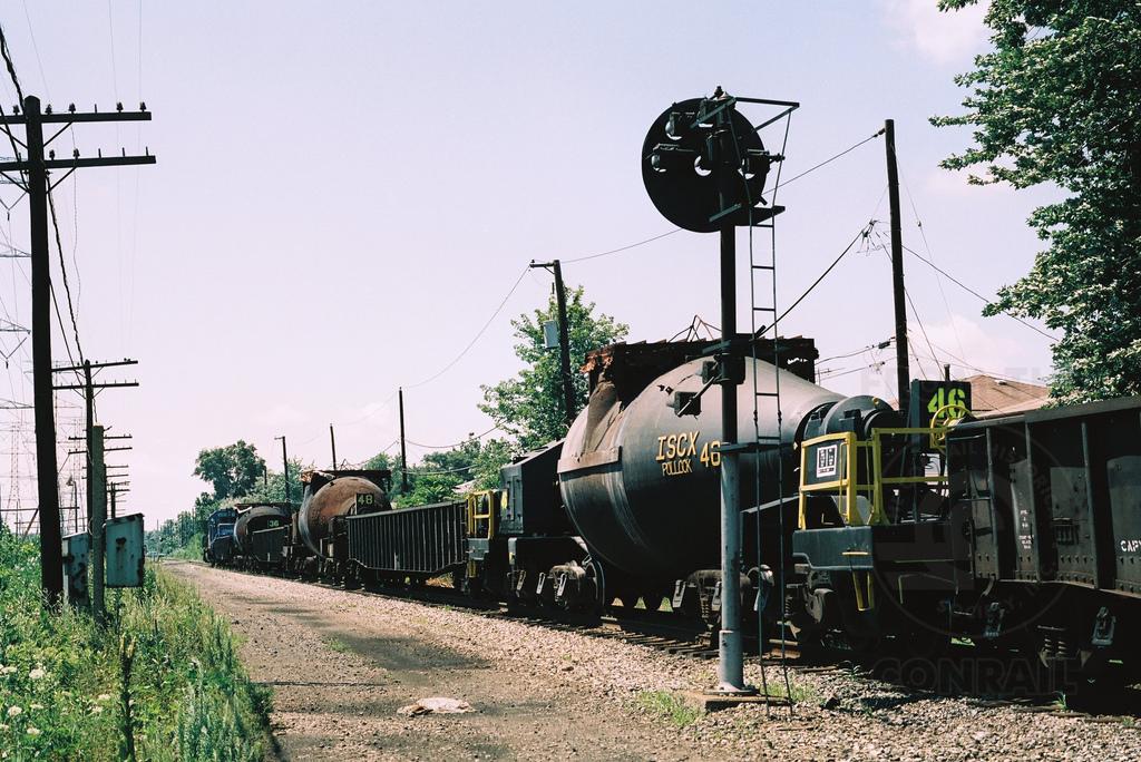 Previous Next Conrail's hot Metal Train rolls east on the SC&S Bernice Cut-off, the bottle cars passing the former PRR position light signal at Hegewisch. Doug Davidson photo with permission Photo By Doug Davidson Year 1991 Original Date 7/1/91 Conrail Number 1680 Collection CRHS Conrail Photo Archive Contributions