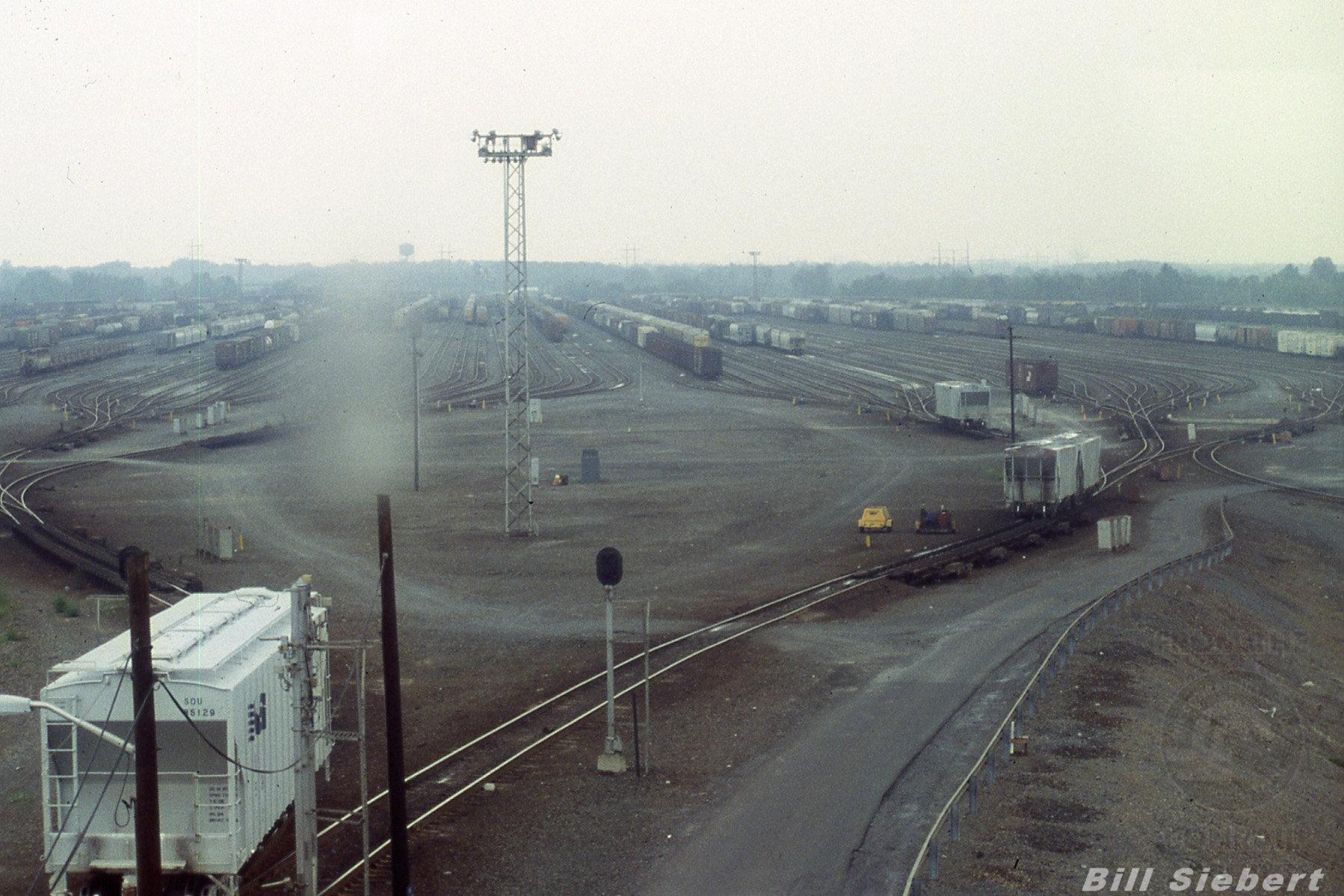 View east from the Selkirk Hump tower as free rolling cars are diverted here and there onto different bowl tracks. 1992 visit with Mohawk & Hudson NRHS chapter.