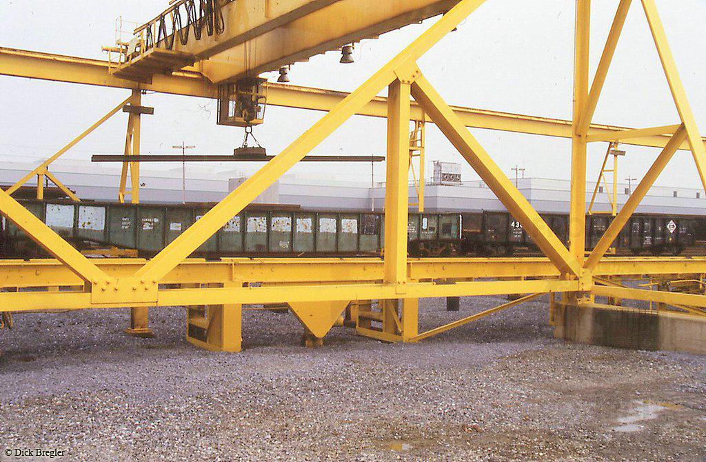 A shot of rail being unloaded from gondolas, one of which appears to be a Reading paint-out at Lucknow in 1986.
