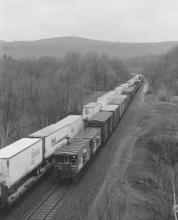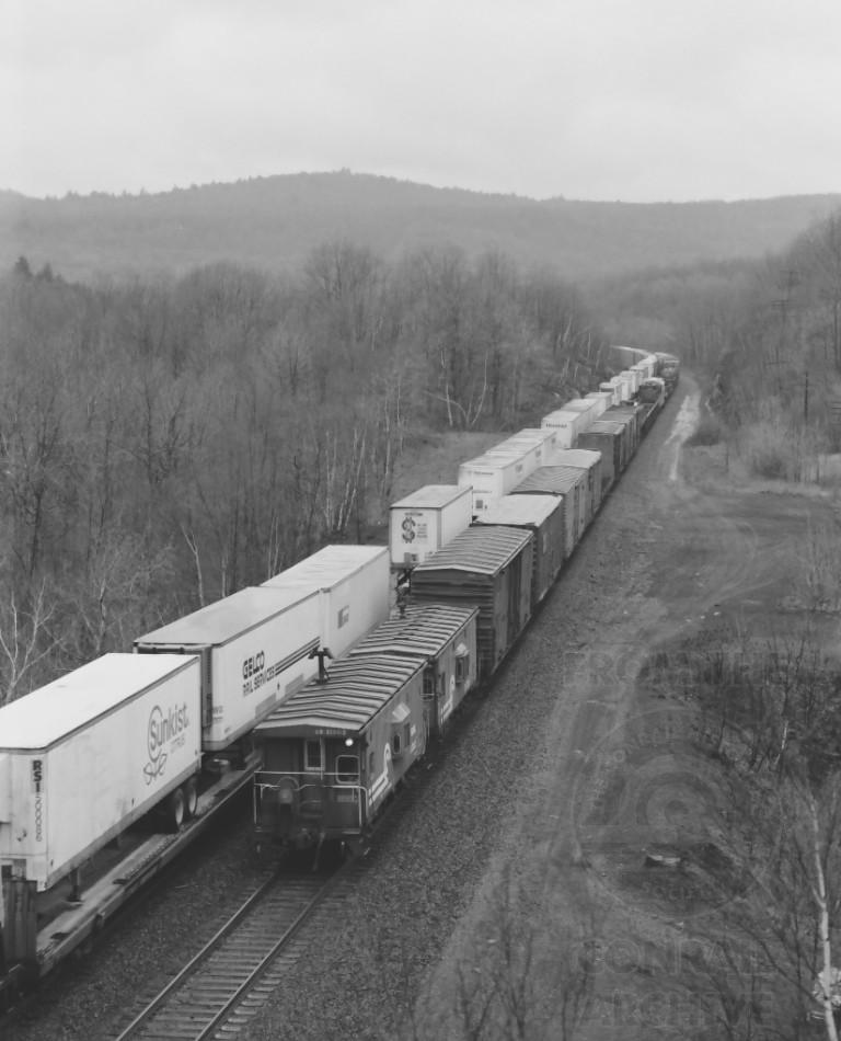 N21 van 21302 has the rear on BOEL with an N21 ahead of it, whose number is not legible, as the rear of the train enters Middlefield (Bancroft), MA.