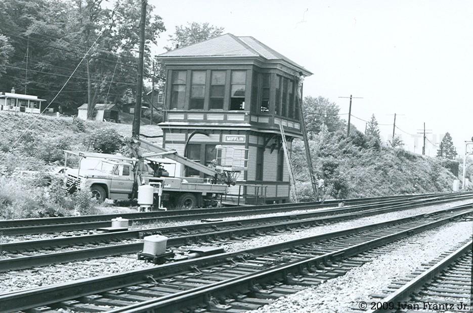 Previous Next Mifflin Interlocking Tower. Seen here getting a new coat of paint courtesy of the CR B&B department. Photo By Ivan Frantz Jr. Year 1981 Original Date 6/25/81 Location City Mifflin PA Line or Locale Conrail's Pittsburgh Line Collection CRHS Conrail Photo Archive Contributions